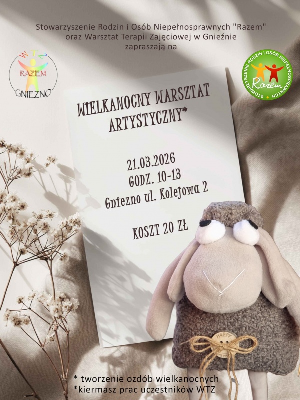 Na XXIV Drzwiach Otwartych WTZ Gniezno (Wielkanocny Warsztat Artystyczny) spotykamy się w sobotę 21 marca w godz. 10:00 - 13:00, w siedzibie Warsztatu Terapii Zajęciowej w Gnieźnie, przy ul. Kolejowej 2. Koszt warsztatu wynosi 20 zł.