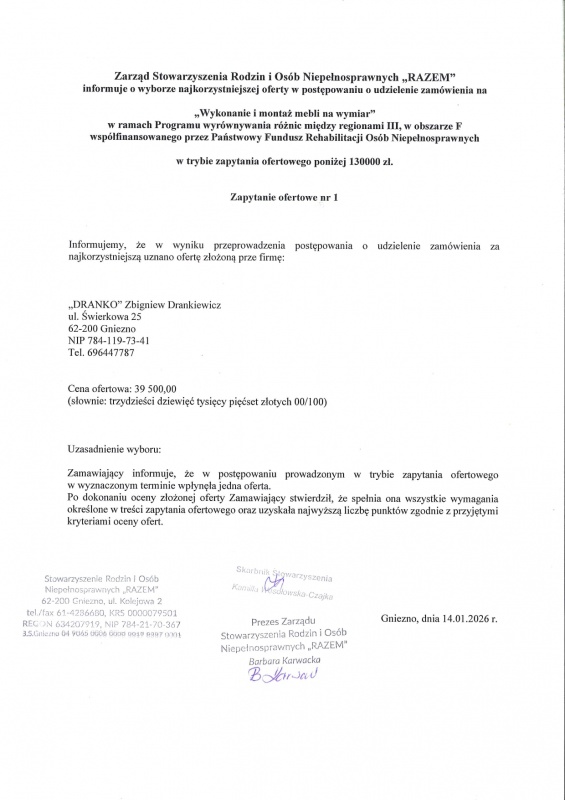 Zarząd Stowarzyszenia Rodzin i Osób Niepełnosprawnych „RAZEM” informuje o wyborze najkorzystniejszej oferty w postępowaniu o udzielenie zamówienia na „Wykonanie i montaż mebli na wymiar” w ramach Programu wyrównywania różnic między regionami III, w obszarze F współfinansowanego przez Państwowy Fundusz Rehabilitacji Osób Niepełnosprawnych w trybie zapytania ofertowego poniżej 130000 zł.